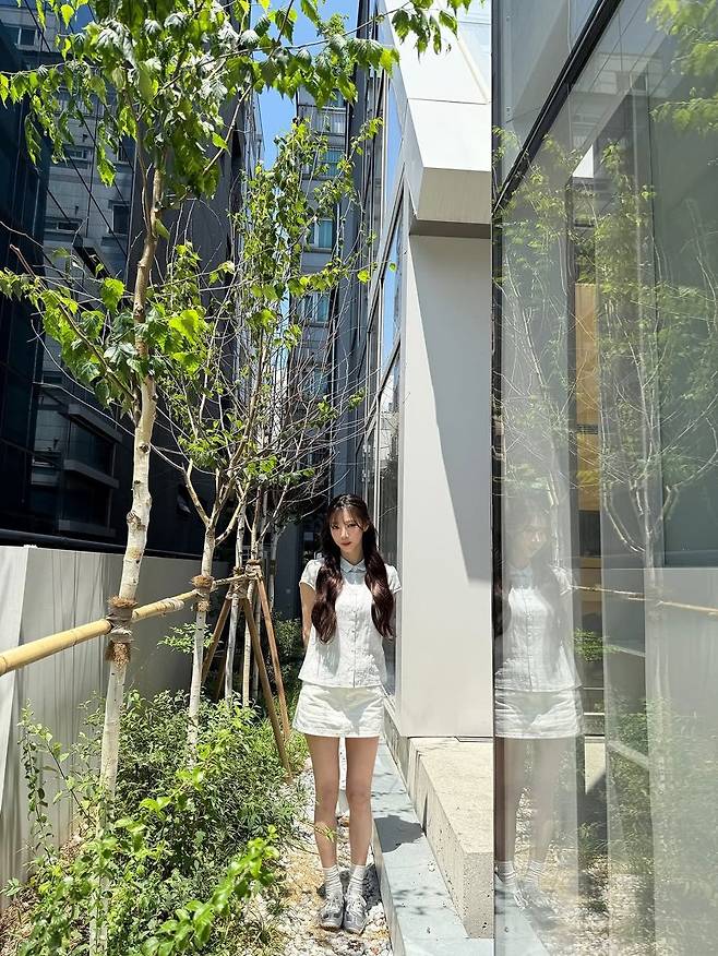 전체적으로 올화이트 컬러감이 한여름 햇살과 어우러져 산뜻하고 청량한 인상을 주며, 발끝까지 더해진 화이트 삭스와 실버 스니커즈 조합이 톤온톤 스타일링의 정수를 보여준다. 풍성한 웨이브 헤어와 은은한 메이크업은 내추럴한 분위기를 배가시켰고, 팬들은 “이게 진짜 여름룩”, “보기만 해도 시원하다” 등의 댓글로 반응했다.