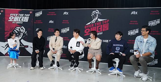 10월 25일 오전 JTBC 새 예능 프로그램 '오버 더 톱-맨즈 챔피언십'(이하 오버 더 톱) 온라인 제작발표회가 열렸다. 이 자리에는 MC 전현무를 비롯해 서포터즈 문세윤, 이진호, 김민경, 하승진, 윤현준 CP가 참석해 프로그램에 대해 소개하는 시간을 가졌다.