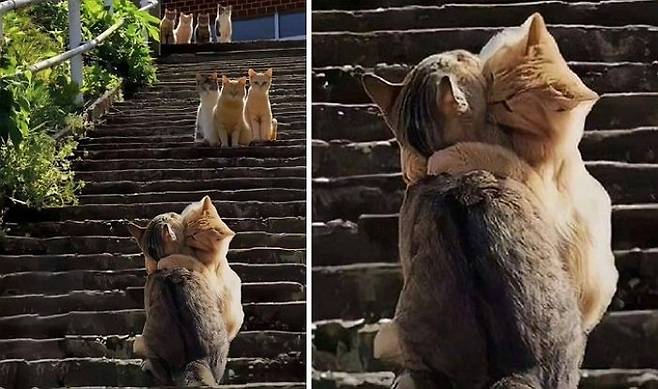 길거리에서 민망하게 애정표현을 하는 고양이 커플이 있는데요