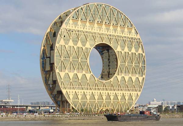 중국 광저우에는 원반 모양의 빌딩이 있다. 높이는 138m에 달하며, 33층으로 이뤄진 거대한 건축물이다. 에너지, 화학기업인 훙다싱예그룹의 사옥으로, 중국 왕조를 상징하는 황실의 심벌을 형상화했다. 내부에 뚫린 구멍은 지름이 거의 50m에 달한다. 두 개의 파사드로 지지된 내부 공간은 사각 볼륨으로 원형면을 따라 적층돼 있다. 애초에 광저우의 랜드마크를 구축하려는 의도로 만들어졌으며, 실제로 현재 광저우의 랜드마크로 불리고 있다.
