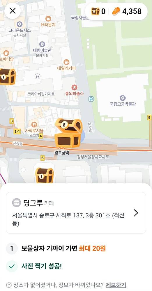 GPS 기반으로 동네 곳곳에 무작위로 나타나는 보물상자 미션은 또 다른 재미 요소다. 특정 위치에 가면 보상을 받을 수 있고, 때로는 사진 후기를 남기며 참여해야 하는 경우도 있다. 이 과정에서 평소 지나쳤던 동네 가게를 발견하거나 새로운 장소를 알게 되면서, 걷기가 단순한 운동을 넘어 작은 탐험처럼 변한다.