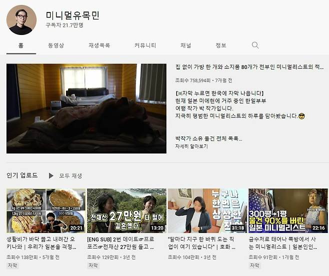 순례길과 미니멀에 관심이 있다면 한번쯤은 본 채널! 미니멀리스트 한일부부로 콘텐츠를 올리면서 최근까지 많은 구독자를 모으고 있는 채널입니다. 일본 현지 상황과 미니멀 라이프에 대해 옆볼 수 있습니다.