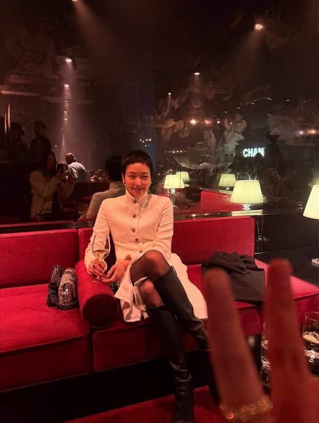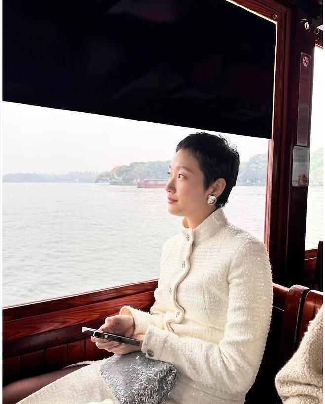 김고은은 화이트 트위드 셋업을 착용해 화사하고 세련된 패션을 선보였습니다.