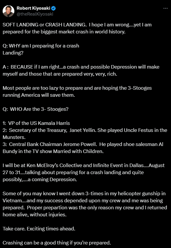 비교적 최근인 8월 중순에는 ‘최악의 시장 붕괴’를 예고했다. 지난 14일 기요사키는 “역사상 최악의 시장 붕괴가 임박했다”며 “연착륙과 경착륙이 모두 어려울 것”이라고 경고했다. 그러면서 바이든 행정부의 고위 인사 카멀라 해리스 부통령, 재닛 옐런 재무장관, 제롬 파월 미 연준 의장을 ‘세 얼간이’에 비유하며 “이들이 구원투수 역할을 맡는 데 실패할 것”이라고 주장했다.