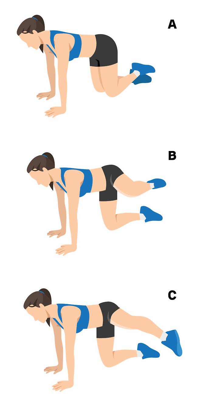 1. 양손을 어깨 아래 위치하고 무릎을 굽혀 테이블 자세를 만든다.