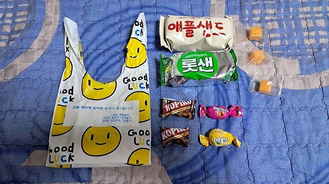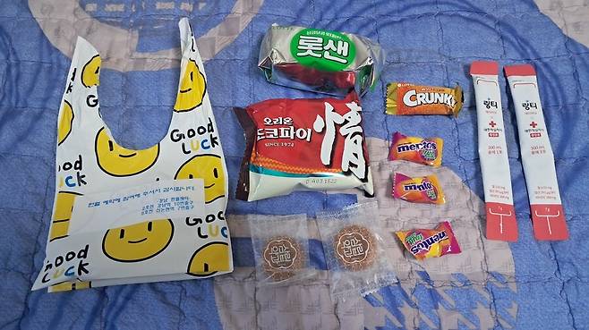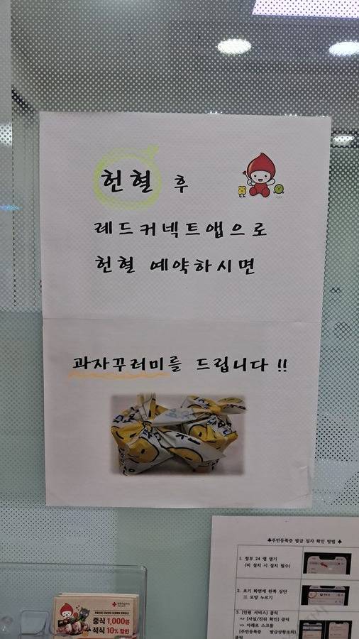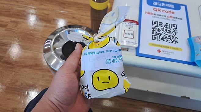 그러다가 여기만 그러는지 모르겠지만 작년 하반기 쯤에 앱으로 헌혈 예약을 하면 이렇게 과자 꾸러미를 준다고 하네요.