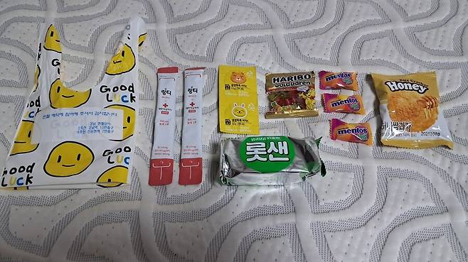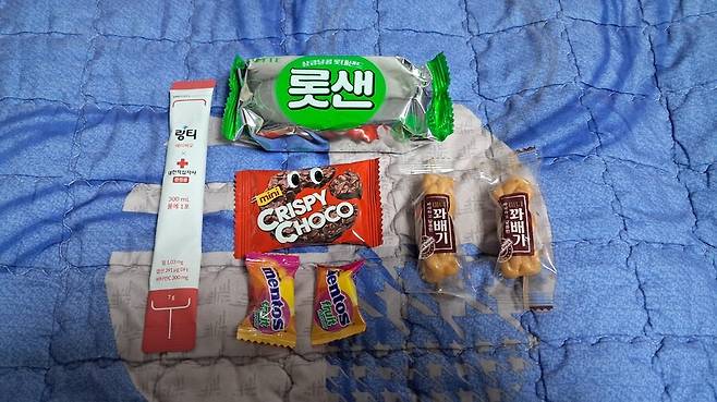 링티 2, 비타민 C 캔디 2, 하리보 젤리, 롯데샌드, 멘토스 3, 허니쌀과자