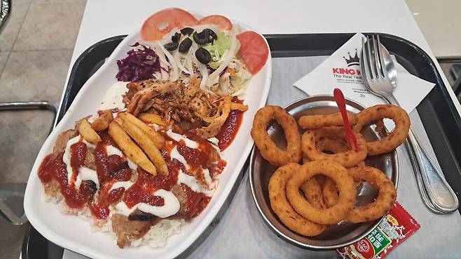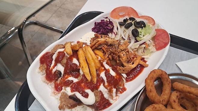 쌀밥을 덮은 양고기 케밥에 매운 소스, 요거트 소스 약간의 감자튀김 그리고 매콤하게 양념한 닭고기 케밥에 야채 샐러드