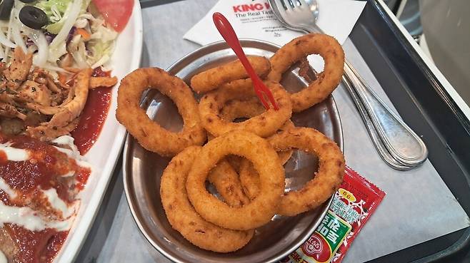 제가 양파링, 어니언링을 좋아해서 먹을 수 있는 곳에 가면 무조건 감자튀김 대신에 이걸 먹어요.