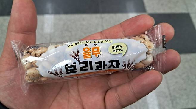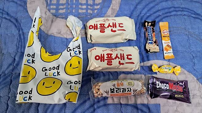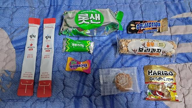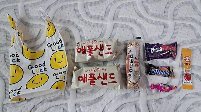 애플샌드 2, 율무 보리과자, 땅콩 초코바, 비타 500(가루 형태), 담라 캔디(레몬맛), 초코 무초
