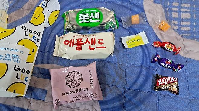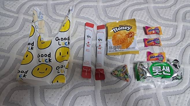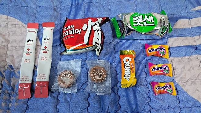 링티 2, 롯데샌드, 땅콩카라멜, 멘토스, 땅콩 초코바, 율무 보리과자, 미니 약과, 하리보 젤리