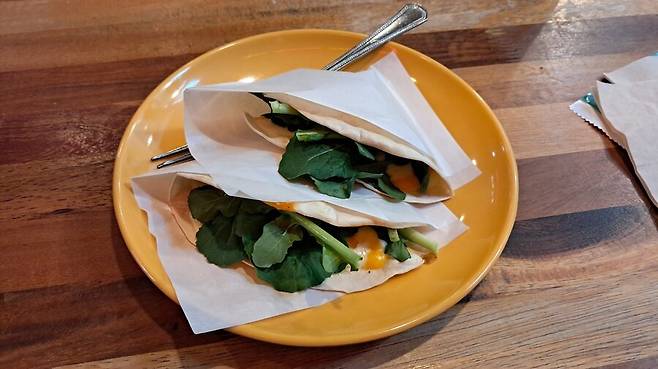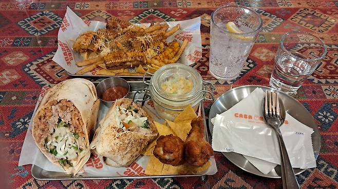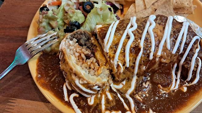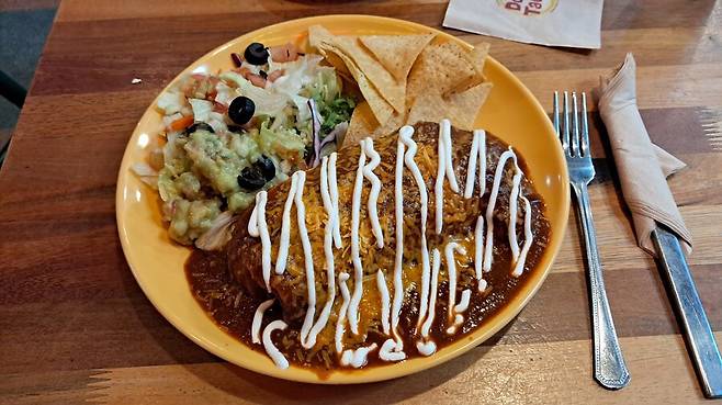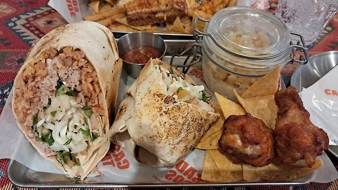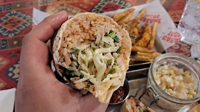 그냥 멕시코 양념이 좀 들어간 밥에 멕시코 양념이 약한 돼지고기, 양배추 위주의 생 야채에 콩 같은 것도 없고 살사 맛도 안 느껴지고
