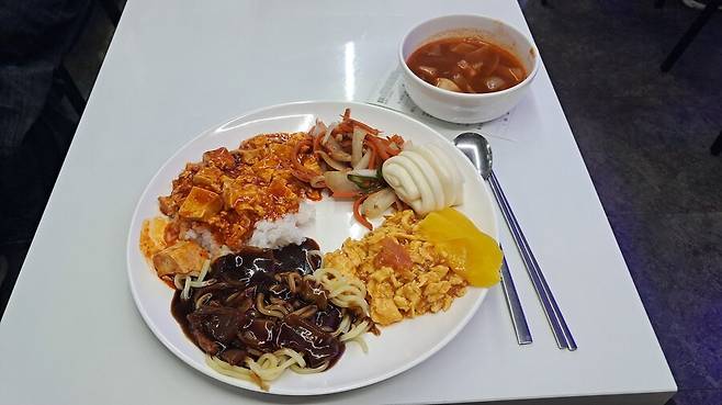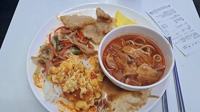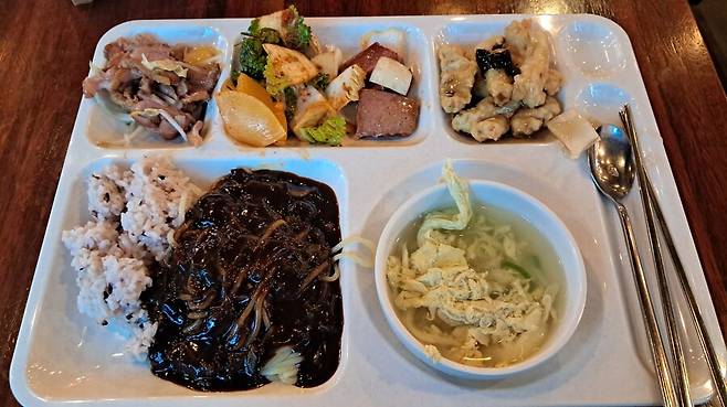 물기가 많은 면에 양만 잔뜩 불린 짜장, 탕수육은 당연히 제품을 썼고 햄볶음은 너무 저렴한 햄을 썼으며
