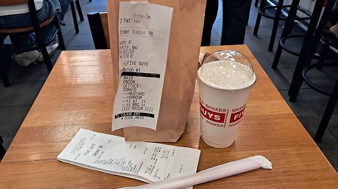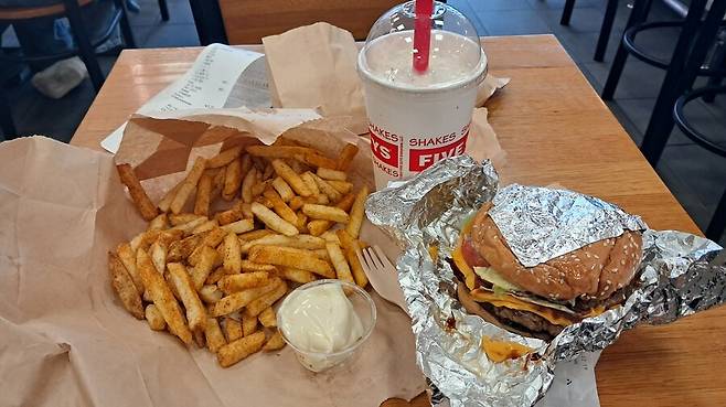 쉑쉑버거야 최근에 세트 메뉴를 실시했지만 파이브가이즈는 세트가 없어서 햄버거 따로 감자튀김 따로 밀크쉐이크 따로 주문