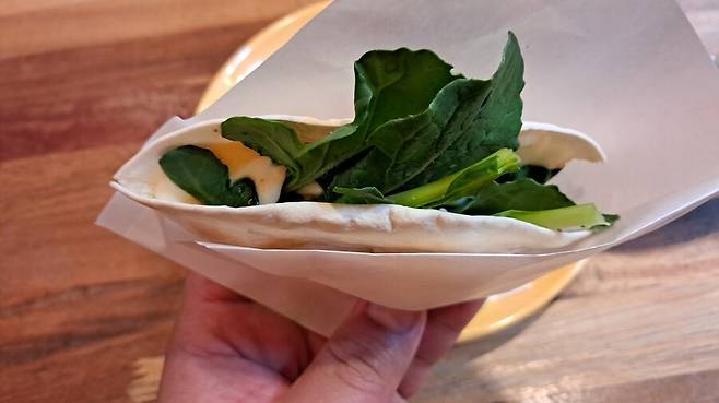 이곳만의 가장 큰 특징인 써브웨이처럼 토핑과 소스를 자신이 원하는 스타일로 넣어서 먹는 것