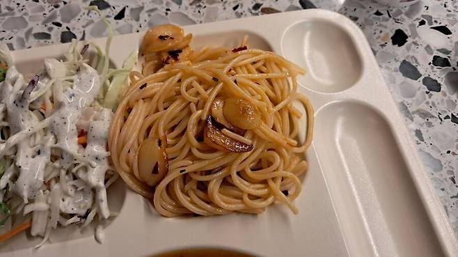 퍽퍽하지만 매콤하면서 고소한 마늘 향과 기름 맛이 가득해서 점심뷔페 파스타치고는 맛있었어요.