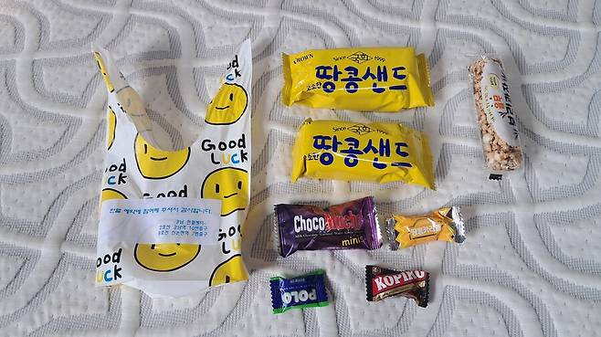 애플샌드 2, 율무 보리과자, 땅콩 초코바, 비타 500(가루 형태), 담라 캔디(딸기맛), 초코 무초