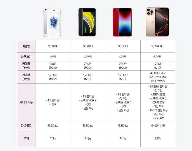 2016년부터 출시된 아이폰 SE 시리즈는 최신 모델인 16 프로 맥스의 카메라와 비교하면 확연히 떨어진다. SE 1세대 기준으로 전면 카메라는 화소수가 10배 차이 나며 후면 카메라는 메인 카메라 기준으로 4배까지 벌어진다. 싱글 카메라에 불과한 SE 시리즈와 다르게 16 프로 맥스는 초광곽, 망원까지 트리플 렌즈 구성이기도 하다.