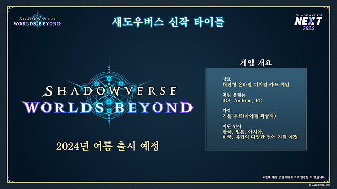 사이게임즈코리아는 자사가 서비스 중인 온라인 CCG '섀도우버스'의 신작 타이틀 '섀도우버스 월즈 비욘드'를 2024년 여름에 출시한다.