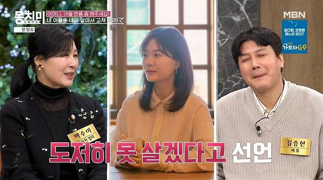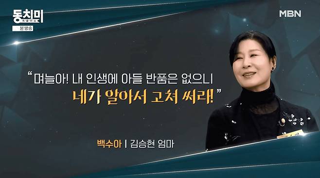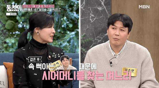 김승현 어머니는 "내가 잘 키워 보냈더니 며느리가 불평을 하더라. 반품은 없으니까 어떻게 알아서 고쳐 쓰라고 했다"며 며느리를 달래고 아들을 타일렀던 과정을 설명했다. 특히 "결혼했으면 내 아들 아닌 네 남편"이라는 확고한 입장을 보이며 아들이 며느리에게 맞춰 살아야 한다고 조언했다고 전했다.