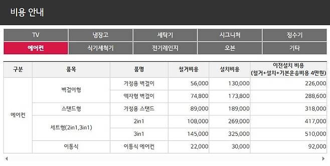 ※ 이전설치 비용 = 철거비용 + 설치비용 + 기본운송비용(40,000원)