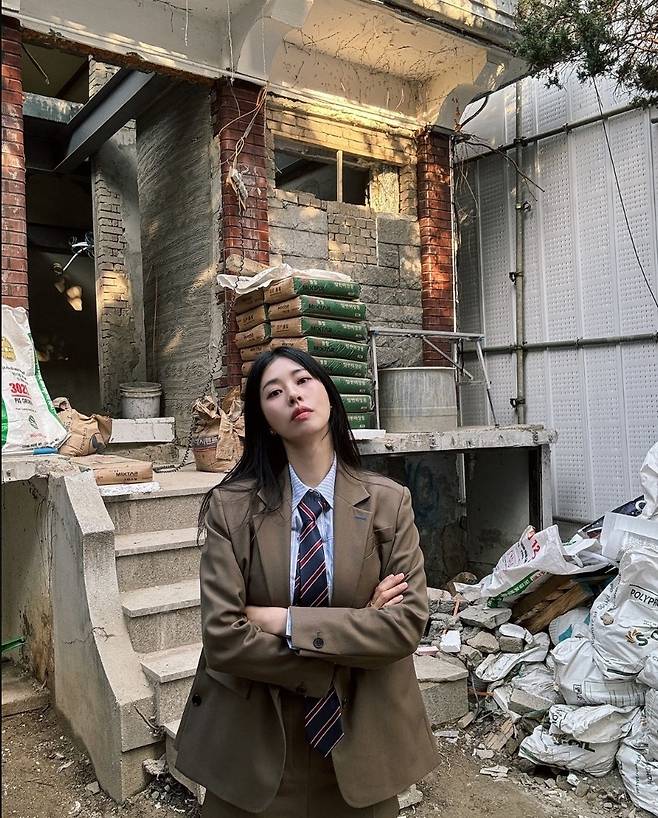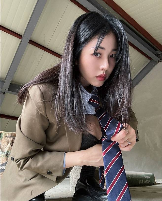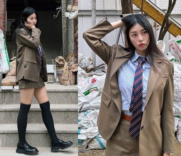 서동주는 고전적인 체크 타이와 빈티지한 브라운 컬러 재킷을 매치해 독특한 스쿨룩을 연출했습니다.