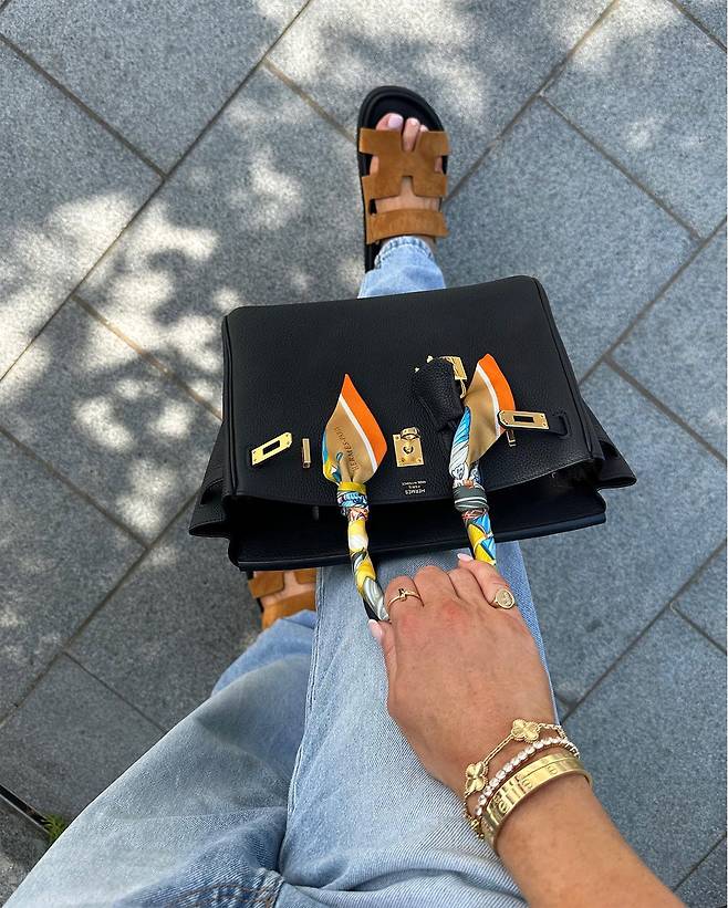 가방 손잡이를 따라 스카프를 묶는 것은 가장 클래식한 방법이다. 어떤 스카프를 매치하는지에 따라 다른 분위기를 낼 수도, 자신만의 취향을 드러낼 수도 있다. 디지털 크리에이터로 활동 중인 프레야는 블루와 오렌지 컬러가 돋보이는 에르메스 트윌리 스카프를 감아 봄 분위기를 한층 더했다.