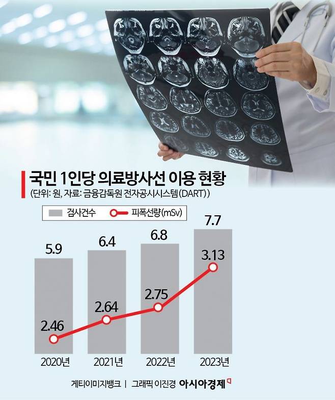 한국인의 의료방사선 검사 수는 선진국의 7배 수준인 것으로 나타났다. 질병관리청의 '2023년 국민 의료방사선 이용 현황'에 따르면 지난해 국민 한 사람이 평균적으로 7.7건의 의료방사선 검사를 받았다. 스위스(1.1건), 유럽연합(EU)(0.5건) 등 다른 나라에 비해 검사 수가 많다. 한국인 1인당 피폭선량도 ▲2020년 2.46밀리시버트 ▲2021년 2.64밀리시버트 ▲2022년 2.75밀리시버트 ▲2023년 3.13밀리시버트로 증가 추세다.