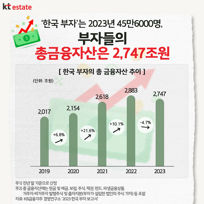 지난해와 비교해 보면, 부자 수는 7.5% 증가한 반면, 부자들의 총금융자산은 4.7% 감소했는데요. 금리 상승으로 주식과 채권 가치가 크게 하락하면서 2023년 부자의 금융자산 규모가 2019년 이후 4년 만에 역성장으로 돌아섰습니다.