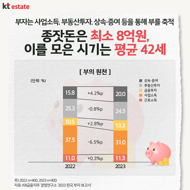 부자들은 어떻게 많은 자산을 모을 수 있었을까요? 가장 주된 원천은 ‘사업소득(31.0%)’으로 나타났습니다. 자산 축적 수단으로 ‘사업소득’(31.0%)은 ‘근로소득’(11.3%)에 비해 3배 정도 많았는데요. 축적된 자산을 불리는 수단으로는 ‘부동산투자’(24.5%)가 ‘금융투자’(13.3%)에 비해 2배 정도로 높게 나타났습니다. 그 외에도 상속·증여 등으로 부자가 된 경우도 20%나 됐습니다.