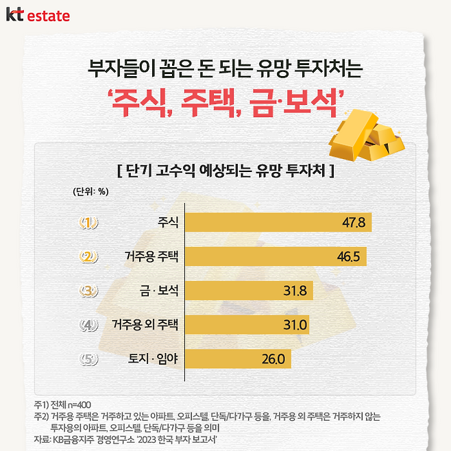 향후 1년 이내 단기에 고수익이 예상되는 투자처로는 ‘주식’(47.8%), ‘거주용 주택’(46.5%)을 꼽는 부자들이 많았고, ‘금∙보석’(31.8%), ‘거주용 외 주택’(31.0%)도 높은 순위를 차지했습니다. 중장기적으로 고수익이 기대되는 유망 투자처도 단기 유망 투자처와 동일하게 주택(거주용 주택 44.3%, 거주용 외 주택 32.3%), ‘주식’(44.0%), ‘금∙보석’(32.0%) 등을 선호한다고 나타났습니다.