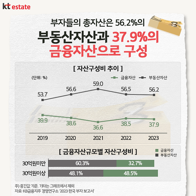 부자들의 자산 포트폴리오를 한 번 들여다볼까요? 2023년 우리나라 부자의 총자산은 부동산 56.2%와 금융자산 37.9%로 구성됐습니다. 그 외 예술품과 회원권 등 기타 자산이 일부를 차지했습니다. 일반 가구의 총자산이 부동산자산 80.2%, 금융자산 15.6%로 구성된 것과 비교하면, 부자의 금융자산 규모는 일반 가구 대비 2배 이상 높았습니다.