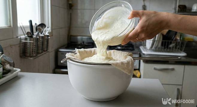 ⑤ 완성된 요거트를 면포에 붓고 체 위에 올려 2~3시간 수분을 뺀다.