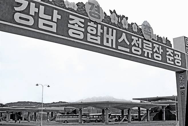 | ▲ 강남종합버스터미널 임시 준공 1976년 9월 1일 강남고속버스터미널이 완공되어 구자춘 시장과 운수업계 관계자들이 참석한 가운데 개장되었다. 4개월 만에 급조된 고속버스터미널은 5만평의 허허벌판에 세 개의 승차장과 300평 규모의 공동정비고가 전부였다. |
