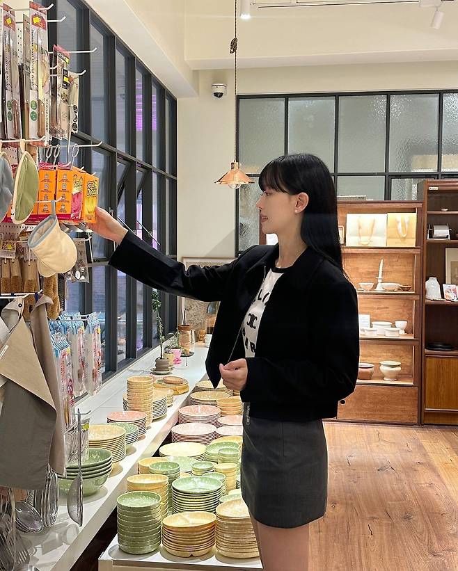 사진 속 강한나는 화이트 크롭 티를 이너로 입고 블랙 크롭자켓과 가죽 미니 스커트를 입고 긴생머리와 함께 청순미를 자랑했다.