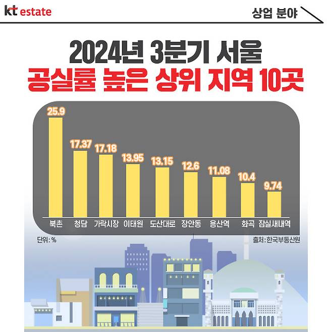 공실률이 낮은 지역으로는 광화문(0.00%), 압구정(0.00%), 강남대로(0.00%), 건대입구(0.00%), 상봉역(0.00%) 등 제로 공실률을 나타낸 곳도 적지 않았습니다. 단, 서울 내에서도 북촌(25.90%), 청담(17.37%), 가락시장(17.18%), 이태원(13.95%) 등은 높은 공실률을 보이며 극과 극의 모습을 보였습니다. 그렇다면 같은 서울 지역 내에서도 이렇게 큰 공실률 격차는 무엇 때문일까요?