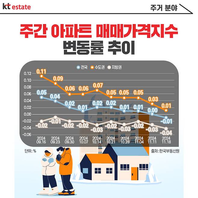 집값이 약 반년 만에 드디어 내림세로 돌아섰습니다. 한국부동산원에 따르면, 전국 주간아파트 매매가격지수 변동률은 11월 2주차 0.00% 이후 11월 3주차에 -0.01%를 기록하며 하락률을 기록했습니다.
