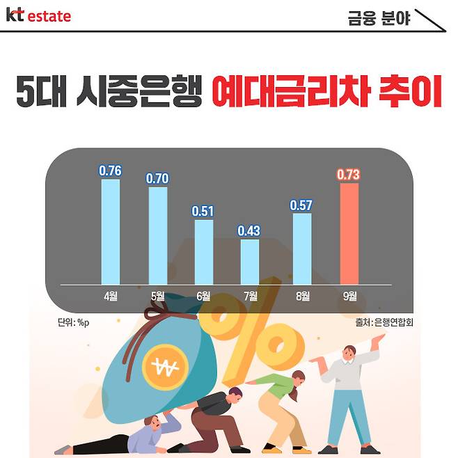 게다가 예금 금리가 내리면서 예대금리차(예금과 대출 금리 차이)마저도 점점 더 크게 벌어지고 있습니다. 은행연합회 자료에 따르면, 5대 시중은행 예대금리차는 7월 0.43%p에서 8월 0.57%p, 9월 0.73%p로 점차 상승했습니다. 10월과 11월에는 이보다 더 커질 것으로 전망되는데요. 정부가 가계대출 총량을 잡고자 한 규제가 은행 배불리기만 한다는 지적이 나오는 이유입니다. 이에 정부 및 여당에서는 예대금리차 확대를 경고하고 나섰는데요. 향후 연말에는 이러한 예대금리차 확대 기조가 꺾일지 기대를 모읍니다.