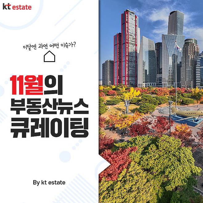 지금까지 주거, 상업, 금융, 숙박시장에 이르기까지 11월 주목해야 할 다양한 부동산 소식을 정리해 봤습니다. 11월에는 정부의 대출 규제 영향이 본격화하면서 주거시장이 침체된 양상을 띠었으며, 상업용 부동산의 경우 지역별로 공실 차이가 양극화된 모습을 보였는데요. 숙박시장은 호텔을 중심으로 객실 점유율이 증가하는 등 회복세를 나타냈습니다. 저희가 준비한 자료는 여기까지입니다. 다음 달도 알차고 유익한 내용으로 돌아올 테니 많은 기대 부탁드립니다!