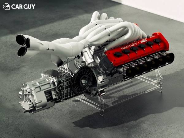 대부분 엔진의 흡기밸브가 'V' 안쪽에 있고 배기가 바깥쪽에 있는 것과 달리 닐루의 V12 엔진은 정반대 방식이다. 12:1 인코넬 배기구는 복잡한 모양인데 이는 3D 프린팅을 통해 제작했다. 3개의 엔드 머플러 팁은 우주 왕복선에서 영감을 받았다고 밝혔다.