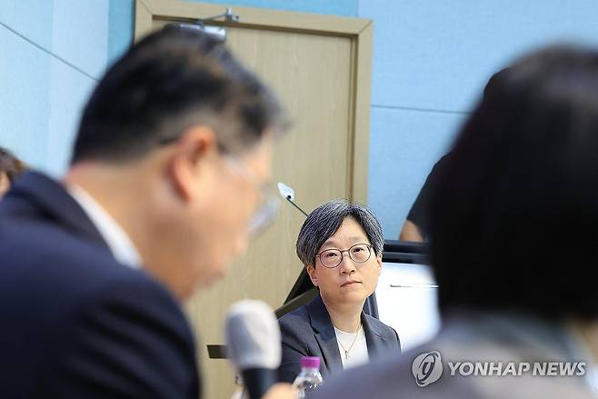 (서울=연합뉴스) 신현우 기자 = 강희경 서울의대·병원 교수 비대위원장이 10일 오후 서울 종로구 서울대 의대 융합관 박희택홀에서 열린 '의료개혁, 어디로 가는가' 토론회에서 장상윤 대통령실 사회수석비서관의 기조발제를 듣고 있다. 2024.10.10