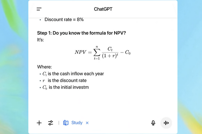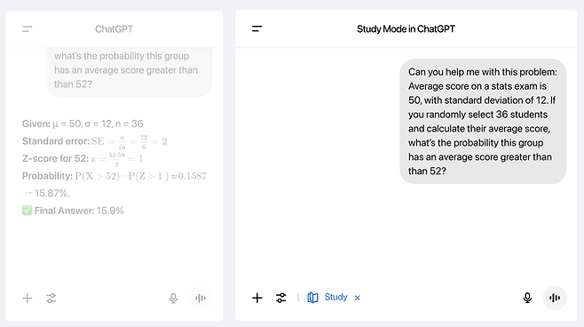 스터디 모드는 단순히 숙제를 대신해 주는 기능이 아니다. 사용자가 문제를 이해할 수 있도록 단계적인 유도 질문을 내놓는다. 이를 통해 사용자가 해당 문제에 대해 심층적으로 이해할 수 있다는 설명이다.