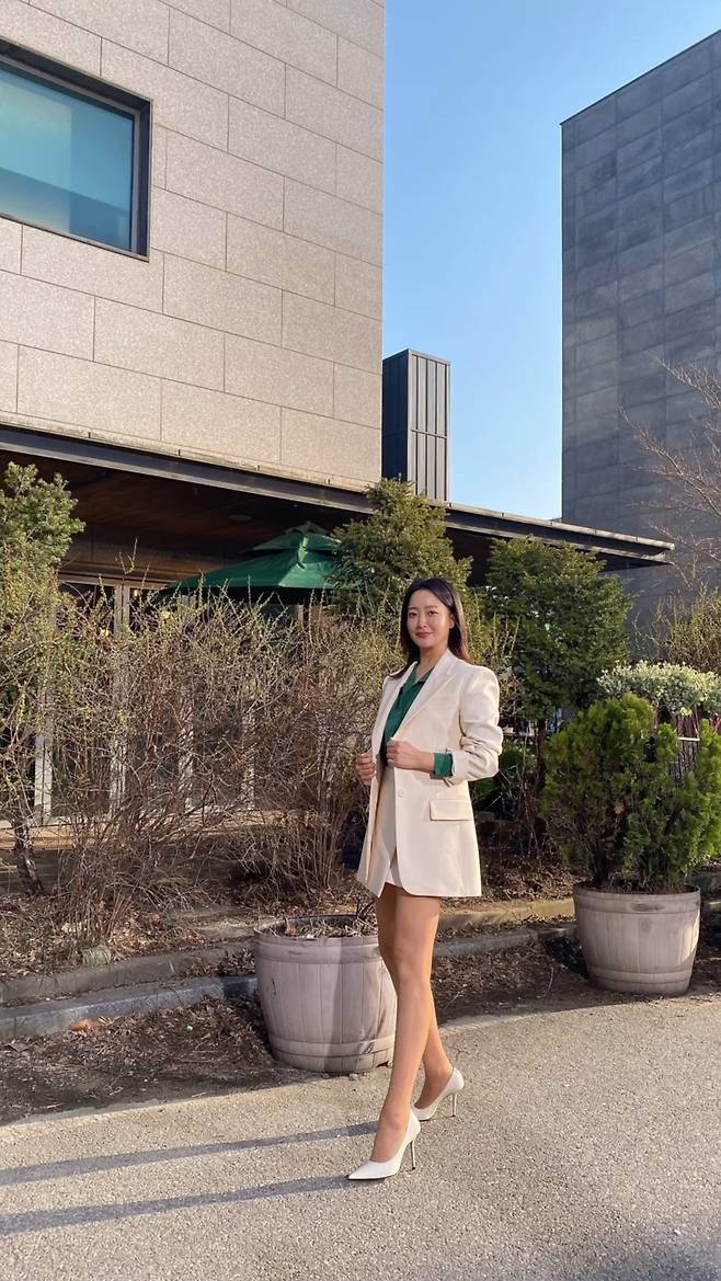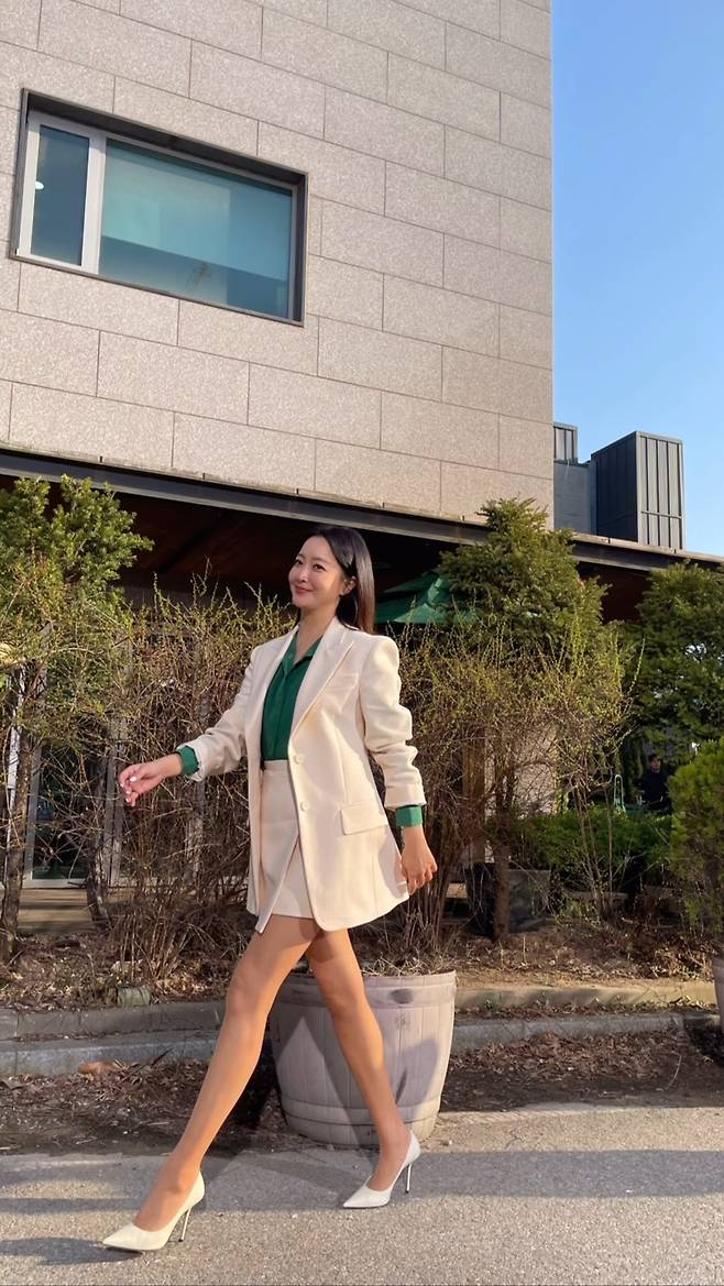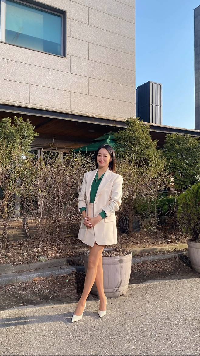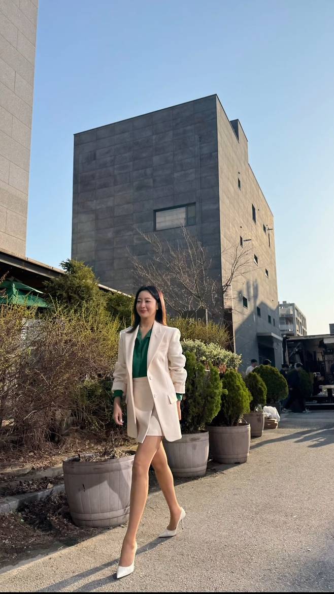 김희선은 동일한 색감의 아이보리 재킷과 스커트를 착용함으로써 깔끔하고 차분한 분위기의 정장 셋업 패션을 완성해 스타일리시한 하의실종룩을 선보였습니다.