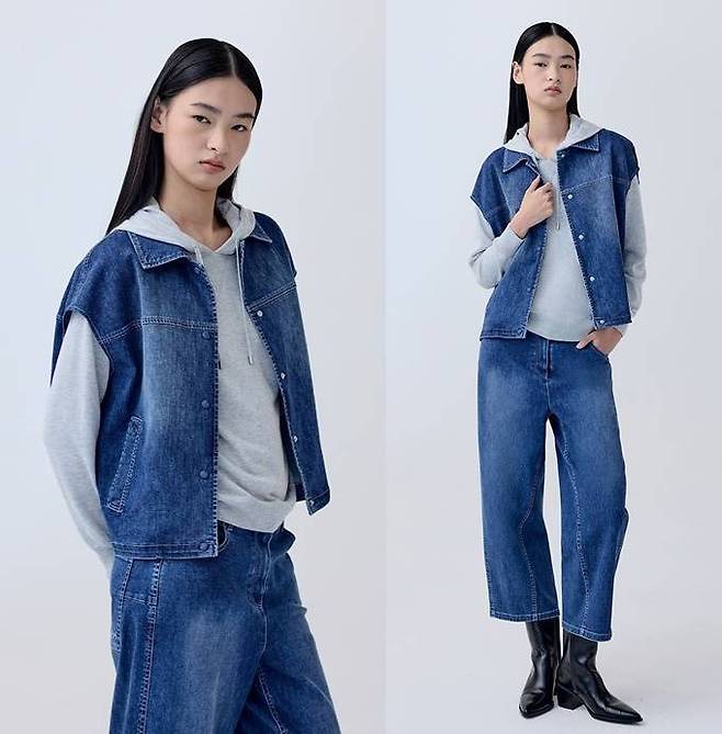 '쁘렝땅' 데님 조끼와 팬츠 셋업의 청청패션은 데님 특유의 캐주얼하고 자유로운 감성을 동시에 즐길수 있는 우아한 데님 드뮤어룩으로 주목받고 있다.