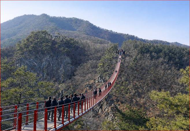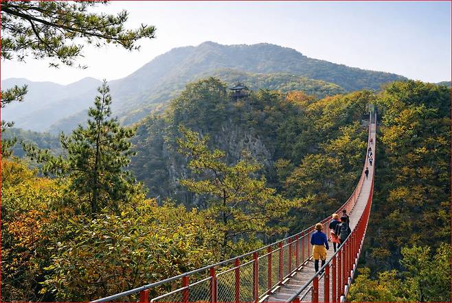 휴전선과 인접하여 북녘의 산하를 지근거리에서 조망할 수 있는 이 장엄한 산에는 산과 산 사이를 붉은 실타래처럼 아찔하게 잇는 특별한 길이 있습니다. 바로 감악산 출렁다리입니다.