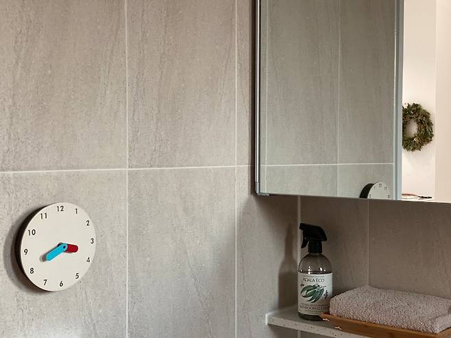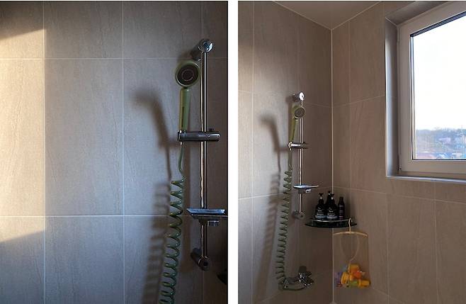 햇살이 깊숙이 드는 다음 공간은 욕실, 화장실입니다. 화장실에 창문이 있는 게 처음에는 어색했는데 빛도 잘 들어오고 환기하기에도 좋더라구요. 스프링 샤워호스는 꼬임도 없고 바닥에 닿지 않아 물때도 생기지 않아요. 다만 스프링 텐션이 좀 강한데 사용에는 큰 불편함 없어서 만족하는 상품입니다. 특히 컬러가 볼 수록 참 예뻐요.