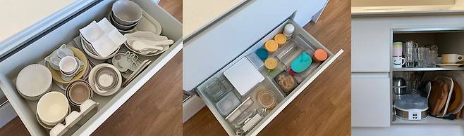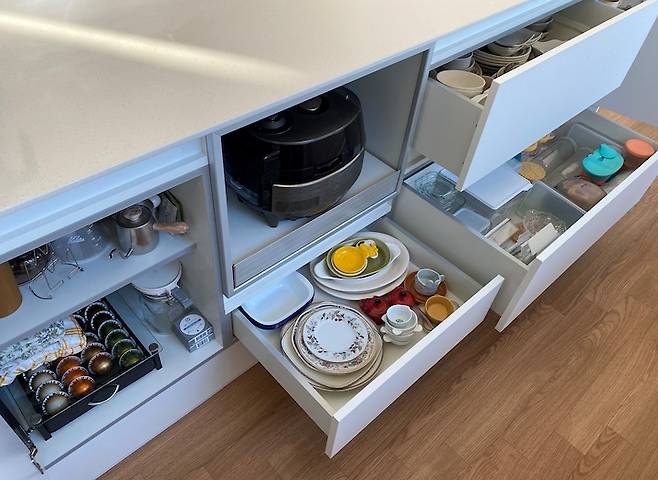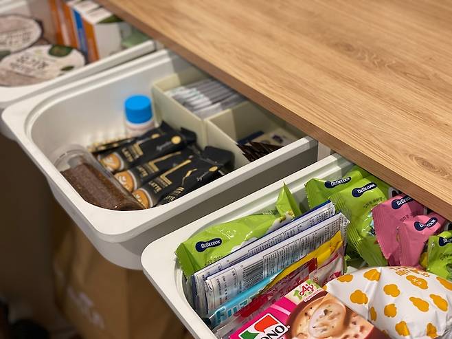 서랍형 수납장이 확실히 사용하기 편리해요. 깊이도 꽤 깊어서 수납력이 좋습니다. 거실 쪽 수납장에는 구급함, 공구함, 물티슈, 휴지, 아이 미술 활동 재료들 등 잡다한 것들을 수납합니다.