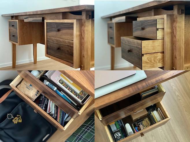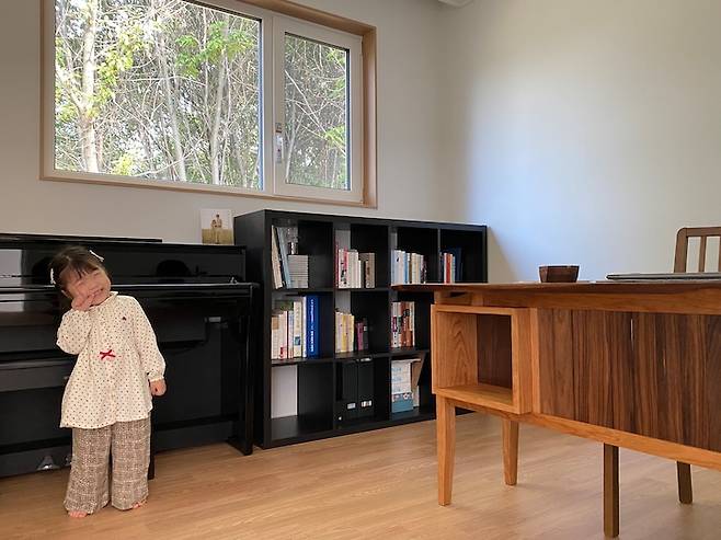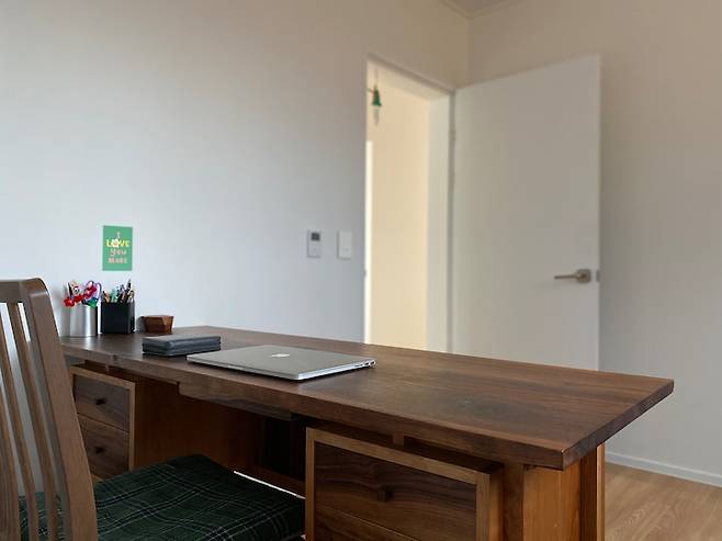 함께 교사를 했던 분이 지금 목수이자 작가로 활동하고 계셔요. 이번에 이사를 하면서 작가님께 서재 책상 제작을 의뢰했습니다. 저희 부부가 원하는 디자인과 수종으로 정말 아름답게 제작해 주셨어요. 이 방에 들어오면 나무 향이 은은히 나서 기분이 참 좋답니다.