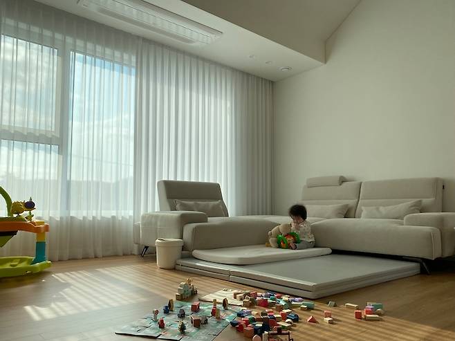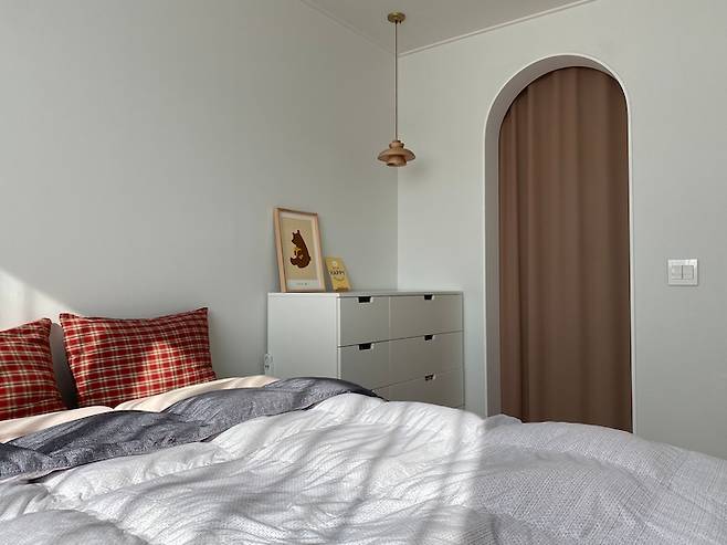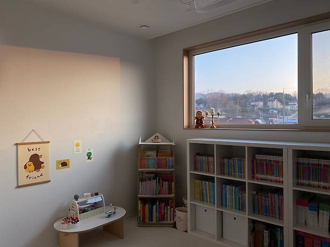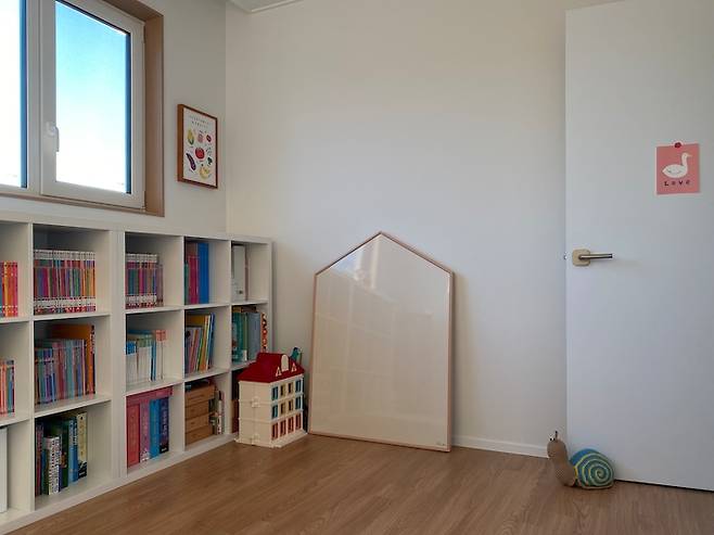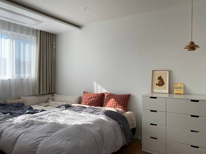 이 방도 해가 참 잘 드는 곳이에요. 저희 아이들은 아직 분리수면을 안 해서 한 방에서 복닥복닥 함께 자고 있어요. 아이가 하나일 때랑 다르게 둘이 되니 수면의 질이 떨어지는 것이 너무 느껴져서 요즘 저희 부부는 분리수면에 대해 진지하게 고민 중이에요. (선배님들 팁 좀 주세요 ..!) 모션 베드 사 놓고 다섯 번은 썼나 몰라요.. ㅜㅜㅎㅎ
