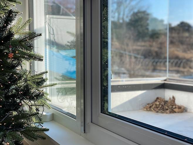 트리 옆으로 보이는 곳은 발코니입니다. 남편은 이 작은 곳에서 하고 싶은 게 많아 보이는데 저는 여기 문을 열어 본 적도 없어요. 앞으로도 이 문을 열 일은 없을 것 같아요. (문 여는 사이 벌레 들어올까봐 무서움)